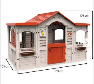 Casa de jardín infantil Le Chalet con un diseño encantador. - Medidas: 159 cm (largo) x 103 cm (ancho) x 104 cm (alto). - Techo a dos aguas rojo. - Puerta y ventanas con detalles. - Maceteros decorativos. En perfecto estado, no tiene casi uso y a estado siempre montada dentro de casa. Precio negociable, nos costó 200€ cuando la compramos.