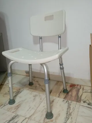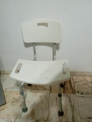 Silla diseñada para facilitar el uso en la ducha o el baño. Su estructura es de metal y el asiento y respaldo son de plástico blanco. - Asiento y respaldo de plástico blanco. - Patas ajustables en altura. - Asas laterales para mayor seguridad. - Agujeros en el asiento para drenaje de agua.