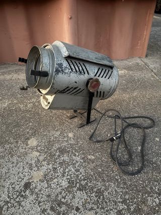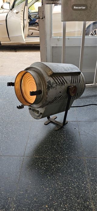 Este es un foco de cine antiguo, con un diseño clásico y robusto. - Cuerpo metálico con acabado desgastado. - Lente Fresnel. - Base de soporte. - Cable de alimentación.