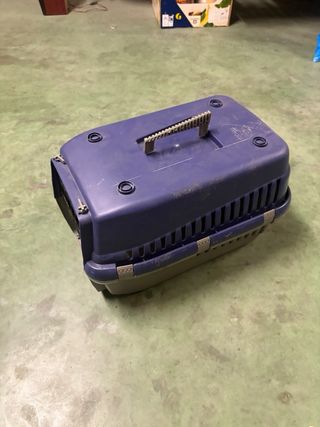 Transportín de plástico resistente para mascotas pequeñas o medianas. - Color azul. - Puerta metálica con cierre de seguridad. - Asa superior para facilitar el transporte.