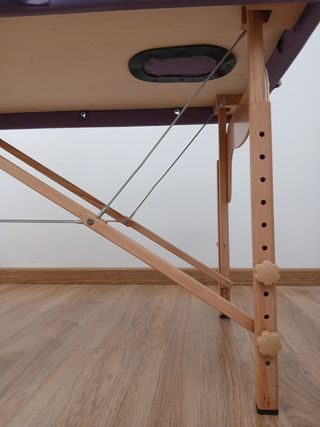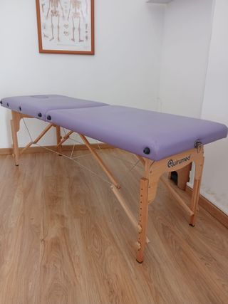 Camilla plegable de madera de la marca Quirumed. Es fácil de transportar y almacenar. Muy cómoda, está nueva. Medidas 60x180 - Estructura de madera resistente. - Tapicería de color lila. - Diseño plegable.