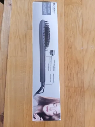 Cepillo alisador de la marca SilverCrest, modelo Personal Care. Cerdas con revestimiento de cerámica de alta calidad para alisar el cabello de una sola pasada. Cuenta con pantalla LED para la visualización de la temperatura. Muy fácil de manejar. - Cable de 190 cm. - Rango de temperatura: 100-200 °C. - Potencia: 58 W.