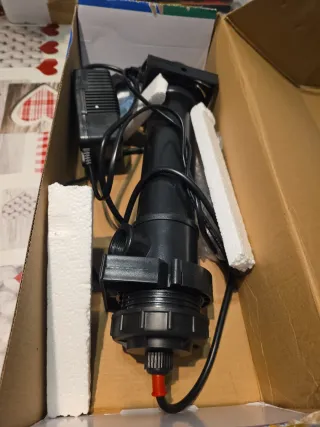 Filtro UV para acuario, ideal para mantener el agua cristalina. Incluye fuente de alimentación. - Diseño cilíndrico negro. - Conexiones para mangueras. - Base con rosca y salida. - Incluye piezas de espuma de embalaje.