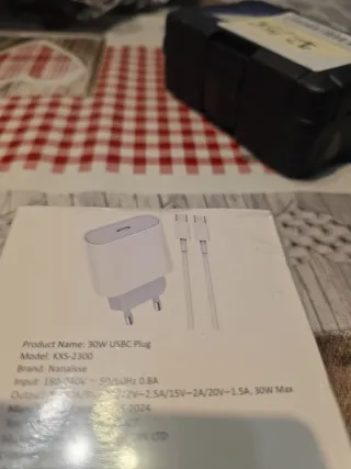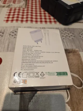Cargador de pared de 30W con puerto USB-C. - Marca: Nanaisse - Modelo: KXS-2300 - Entrada: 180-240V~50/60Hz 0.8A - Salida: 5V-3A/9V-3A/12V-2.5A/15V-2A/20V-1.5A, 30W Max - Fabricante: RICHAN BUTXN LTD - Dirección del fabricante: UNIT B17, ROSEMOUNT FACTORY, 65 ROSEMOUNT AVENUE, LONDONDERRY, NORTHERN IRELAND, BT48 OHL,GB - Lote: 202410151015 - SN: 202410151015