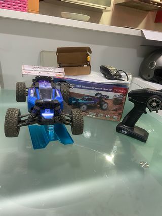 Coche radiocontrolado HSP XSTR 4WD Brushless. - Carrocería azul y morada. - Ala trasera blanca. - Ruedas todoterreno. - Incluye mando a distancia. Dos baterias de 2200 3s Alerón cambiado por uno mas fuerte Motor brushless Ventilador añadió Lo vendo porque no le doy uso por temas de trabajo