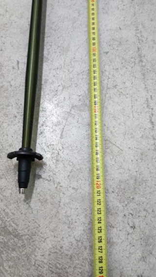 Par de bastones de senderismo telescópicos, ideales para tus aventuras al aire libre. - Color verde oliva. - Empuñaduras ergonómicas negras. - Puntas de goma negras con discos. - Mecanismo de ajuste de altura.