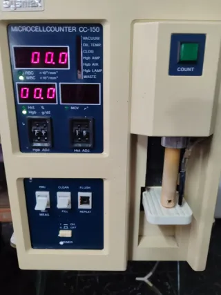 Equipo Sysmex Microcellcounter CC-150. - Modelo CC-150. - Pantallas digitales para lectura de resultados. - Botones de control para funciones como MEAS, CLEAN, FILL, REPEAT y FLUSH. - Indicadores luminosos para VACUUM, DIL TEMP, CLOG, Hgb AMP, Hgb AIR, Hgb LAMP y WASTE. - Botón de COUNT.
