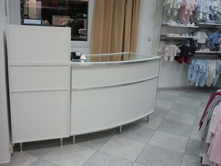 Mobiliario grande de tienda, ideal para comercios de ropa, complementos, moda urbana, infantil, etc. Todo está en muy buen estado y ha tenido muy poco uso. Venta por lotes o de forma individual Disponible: Mostrador curvo blanco lacado y aluminio (puede ser con tapas superior y frontal de cristal o ciega, tenemos las dos tapas), con módulo de caja; Góndola central de 1,5 m de alto × 1,8 m de ancho; Dos mesas redondas con barra/perchero (1 m de diámetro)