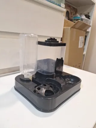 Práctico bebedero y comedero para perros o gatos. Ideal para mantener a tu mascota hidratada y alimentada. - Dispensador de agua automático. - Cuenco para comida. - Diseño en color negro.