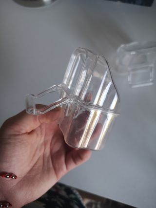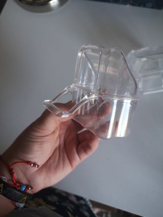 Bebedero o comedero transparente con ganchos para colgar. - Material plástico resistente. - Diseño práctico para aves. Recogido en persona distintos precios