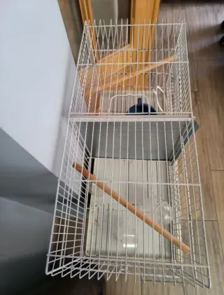 Jaula para pájaros de dos compartimentos, ideal para tener a tus mascotas separadas o para criar. - Estructura de alambre blanco. - Bandeja extraíble para facilitar la limpieza. Incluye tres palos para posarse. Comedero/bebedero - Un embudo color azul. En perfecto estado, Alto 33 y Ancho 58, precio No negociable