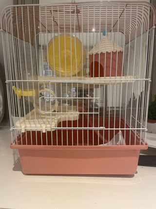 Jaula para hámster de dos niveles con accesorios. - Base de plástico rosa. - Estructura de alambre blanco. - Incluye rueda de ejercicio amarilla. - Casa/refugio rosa con techo blanco. - Bebedero. - Plataforma. - Rampa.