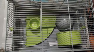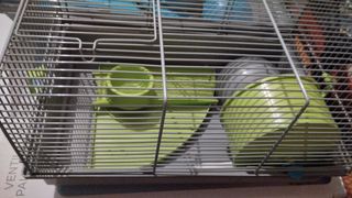 Preciosa jaula para hamster, prácticamente nueva. Incluye varios accesorios: comedero, bebedero, rueda y plataforma. Ideal para una mascota pequeña. Es espaciosa y cómoda para tu pequeño amigo. - Perfecta para hamsters. - Incluye rueda para ejercicio. - Accesorios de color verde lima. - En muy buen estado.