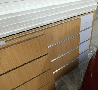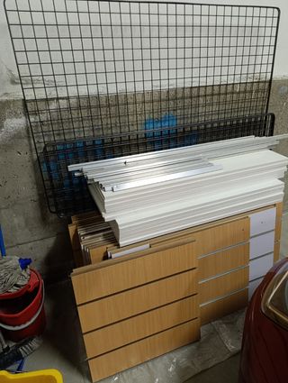 Paneles de lamas blancos y color madera 12u. 2 estanterías multiposicion con 12 baldas y listón cremallera 2,4m. 4 rejillas para colgar producto de 100*150m y 3u. 40cm*150cm. Lote de más de 100 ganchos de todo tipo y largos para reja y panel. Lote de perchas de vestuario. Prepara tu tienda por poco utilizando lo que otro ya no usa. Recogida in situ. Elevado peso. No excesivo volumen.