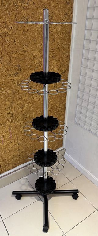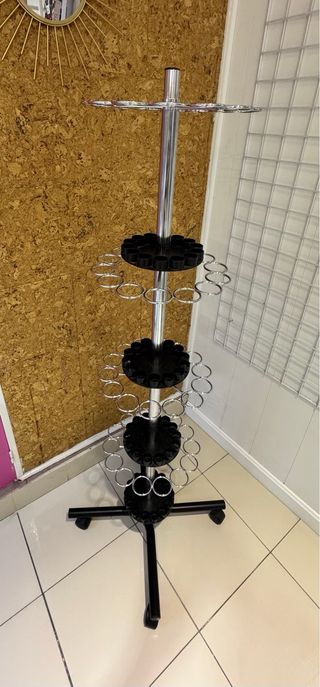Expositor metálico para paraguas, con base giratoria para facilitar el acceso. - Material: Metal. - Diseño: Giratorio. - Color: Plateado y negro.