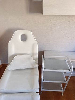 Camilla de estética blanca con sistema hidráulico. Incluye un reposapiés. - Tapicería de polipiel. - Estructura resistente. - Carrito auxiliar con ruedas y tres baldas de cristal. No se hace envío, solo personalmente Se puede cambiar por una de tipo plegable de mi interés y la diferencia