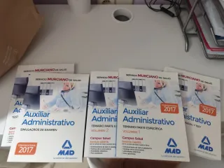 Lote 5 libros para oposiciones de Auxiliar Administrativo del Servicio Murciano de Salud, convocatoria 2017. - Temario Parte Específica Volumen 1. - Temario Parte Específica Volumen 2. - Simulacros de Examen. - Manual General y Test. Al ser de 2017, puede ser ideal como complemento.