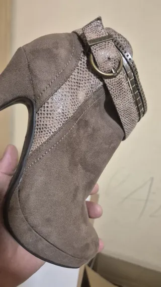 Botines de tacón para mujer en talla 36. Un calzado elegante con un diseño moderno. - Material exterior de ante sintético. - Detalle de hebilla dorada. - Tacón de aguja alto. - Plataforma delantera.