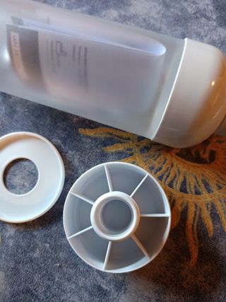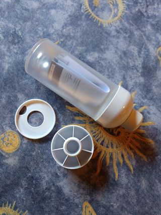 Práctico pastillero integrado en una botella para llevar tus medicamentos contigo. - Diseño translúcido. - Incluye tapa y compartimento para pastillas.