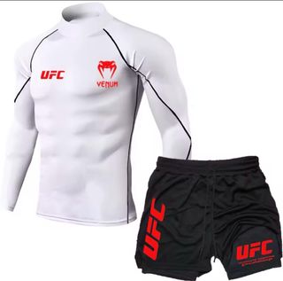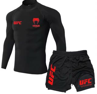 Conjunto deportivo de manga larga y pantalón corto. - Camiseta negra con logo UFC y Venum en rojo. - Pantalón corto negro con logo UFC en rojo.
