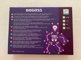Juego de estrategia Bogoss de Djeco, ideal para niños y adultos. De 6 a 99 años. De 2 a 4 jugadores. El objetivo de Bogoss es montar un esqueleto completo combinando seis cartas fosforescentes. ¡Y teniendo mucho cuidado con los huesos rotos! ¿Aceptáis el desafío? Bogoss está formado por 44 cartas fosforescentes con las diferentes partes de un esqueleto: cabeza, tronco, extremidades... Y no son unas cartas cualesquiera: ¡brillan en la oscuridad! Edad recomendada: 6-99 años. Incluye instrucciones en 10 idiomas. En perfecto estado. Las imágenes forman parte de la descripción. #juego #joc #cartas #cartes #cards #educativo