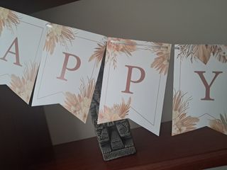 Banderín decorativo de cumpleaños con un diseño floral en tonos tierra. Una docena de globos de diferentes colores y banda de felicitación para 21 años. Cuatro pompones. Sólo el banderín y los globos blancos y tierra tienen el bumero 21. - Diseño: Feliz Cumpleaños. - Estilo: Bohemio/Seco.