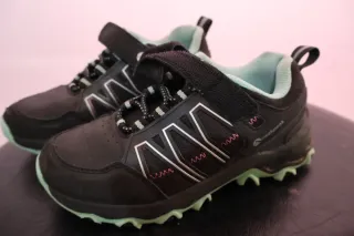 Zapatillas de montaña para niño, ideales para senderismo y actividades al aire libre. - Cierre de velcro y cordones. - Suela de goma con buen agarre. - Diseño deportivo en negro con detalles en verde menta y plateado. - Marca: Sneakpeak.
