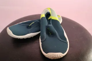 Zapatillas deportivas para niños y niñas, ideales para actividades acuáticas o como calzado de verano. Son ligeras y cómodas. - Color azul marino con detalles en amarillo neón. - Suela blanca antideslizante. - Tejido transpirable. Talla 38 y el bañador talla 12