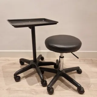 Conjunto de mesa auxiliar y taburete con ruedas, ideal para salones de estética o estudios de tatuaje. - Mesa auxiliar con bandeja. - Taburete con asiento acolchado. - Base con ruedas para fácil movilidad.