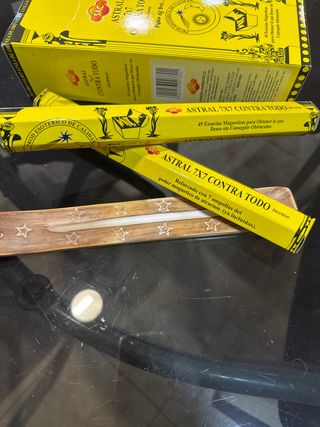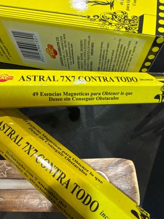 Set de incienso Astral 7x7 y barquita para incienso. - Incienso Astral 7x7 Contra Todo. - Contiene 49 esencias magnéticas. - Reforzado con 7 ampollas de poder magnético de atracción. - Incluye barquita de madera con estrellas.