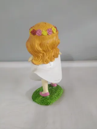 Figura decorativa de una niña vestida de comunión, sentada y rodeada de flores. - Detalle de flores rosas. - Base con césped verde Altura 12 Ancho 08