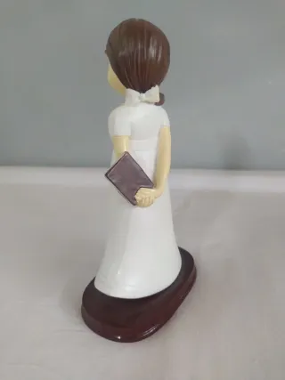 Figura de niña para comunión. - Diseño dulce y tierno. - Viste un traje blanco y lleva un libro y un collar con cruz dorada. - Base de color marrón oscuro. Altura 016 Ancho 009