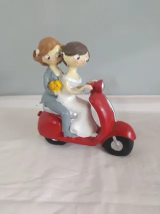 Figura de novios Mopec montados en una moto. - Diseño divertido y original. - Ideal para tarta nupcial. Altura 014 Ancho 017