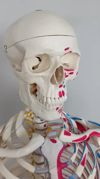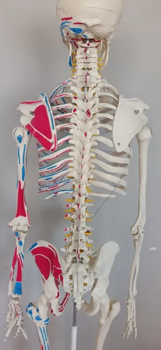 Réplica detallada de un esqueleto humano a tamaño real, ideal para estudios de anatomía o decoración. - Estructura ósea completa. - Marcado de músculos en rojo y azul. - Soporte incluido para exhibición.