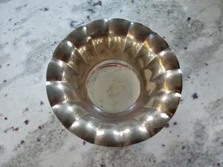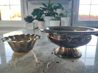 Conjunto de dos piezas decorativas de alpaca, un frutero con borde ondulado y un cuenco con base. - Frutero con diseño de pétalos. - Cuenco con base y detalles ornamentales. - Sólo hago envíos