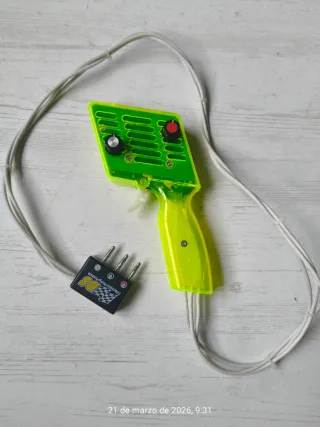 Mando de control para slot de la marca Professor Motor. - Diseño ergonómico en color verde y amarillo. - Dos botones superiores, uno rojo y otro negro. - Gatillo para control de velocidad. - Conector de 3 pines.