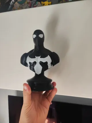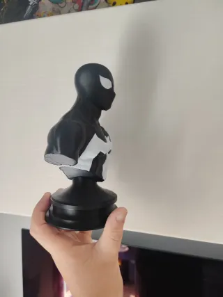 Figura tipo busto de Spiderman, con un diseño en blanco y negro. Es una pieza impresa en 3D. - Diseño de Spiderman. - Impresión 3D. - Color negro y blanco.