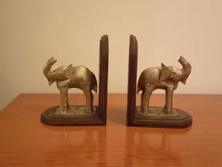 Par de originales reposalibros con forma de elefante. La base es de madera oscura y la figura del elefante es de metal con un acabado dorado. - Diseño único de elefante. - Base de madera. - Figura de metal.