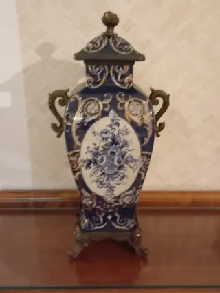 Conjunto de tres jarrones decorativos de cerámica con un diseño clásico en azul y blanco - Tres jarrones de cerámica. - Diseño floral detallado. - Acabados brillantes.