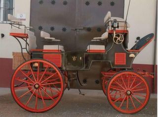Elegante carro de caballos estilo Grand Break, perfecto para eventos o coleccionistas. El carro esta como nuevo, se ha usado menos de 10 veces. - Asientos tapizados en beige. - Ruedas de radios rojas. - Cesta de mimbre. - Detalles decorativos dorados y rojos.