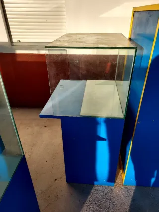 Conjunto de mobiliario para tienda, ideal para organizar y exhibir productos. - Estructura principal de color azul. - Exhibidores de cristal. - Compartimentos de almacenamiento.
