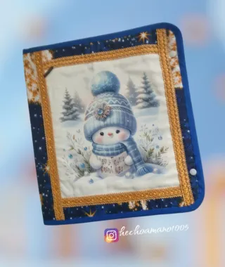 Carpeta de proyecto de tamaño grande para labores o para documentos, con 3 bolsillos grandes, 1 con cremallera y dos más, uno en tela y otro en vinilo, para poner todo lo necesario. Perfecta para guardar hilos, esquemas, bastidor, tela del proyecto. O como portadocumentos y poner todo lo necesario para la oficina o tus estudios. Tamaño cerrado 35,5 cm x 31 cm. Carpeta de proyectos con un diseño invernal de un tierno muñeco de nieve con gorro y bufada. - Cierre con snaps. - Ribete dorado y azul.