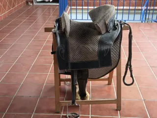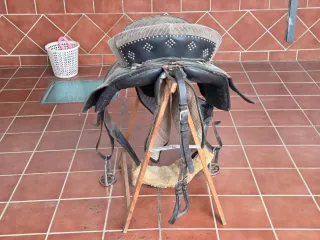 Montura portuguesa en muy buen estado, tiene una montada. Lleva estribos, cincha, baticola.