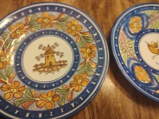 Conjunto de dos platos decorativos de cerámica, cada uno con un diseño único pintado a mano. Ideales para añadir un toque de color y arte a tu hogar. - Plato izquierdo: Diseño de molino de viento. - Plato derecho: Diseño de pájaro. - Motivos florales y elementos naturales en ambos platos. - Borde azul con detalles decorativos. Precio unidad 30€