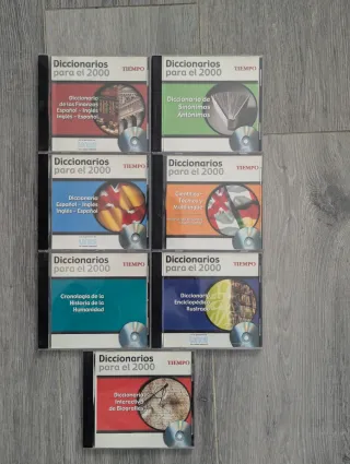 Colección de 6 CDs de Diccionarios para el 2000 de Tiempo. - Diccionario de Sinónimos y Antónimos. - Diccionario de las Finanzas (Español-Inglés). - Diccionario Español-Inglés / Inglés-Español. - Diccionario Enciclopédico Ilustrado. - Diccionario Científico-Técnico y Multilingüe (Español/Inglés/Francés/Italiano/Alemán). - Cronología de la Historia de la Humanidad.
