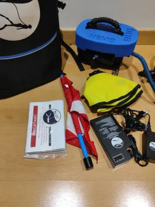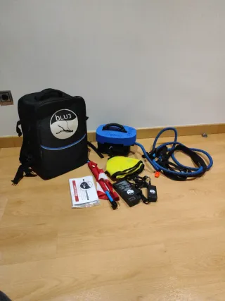 Compresor de buceo Nemo blu3 con accesorios. El compresor no funciona como tal ya que se le rompieron unos imanes que van en el dispositivo y intenté arreglarlo pero no fui capaz se enciende y hace el funcionamiento pero no termina de echar aire lo vendo ya que no sé cómo se repara ni lo uso para manitas o para piezas Vean todas las fotos es descripción del artículo todo lo que aparece en las imágenes es lo que se vende el compresor la verdad que lo he usado cuatro veces se envía a través de wallapop o venta en mano - Incluye bolsa de transporte. - Cargador y batería. - Manguera y cinturón de buceo.