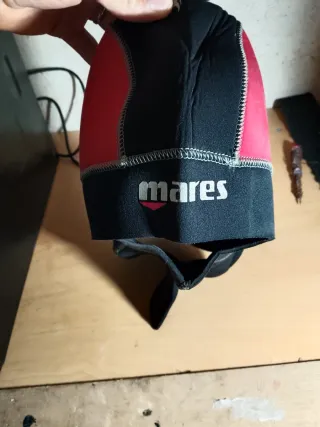 Capucha de neopreno para buceo de la marca Mares. Diseñada para ofrecer comodidad y protección. - Color rojo y negro. - Logo de la marca Mares visible.