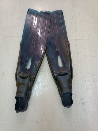 Aletas de apnea calzantes OMER Sporasub, usadas pero en buen estado, talla 37/39. Yo uso un 38 y me quedan como un guante. Las aletas Omer Sporasub Spitfire Kelp te ofrecen ligereza, protección, mimetismo y gran comodidad durante tus prácticas de apnea o pesca submarina. Estas aletas de buceo están hechas con la pala Kelp que incluye un tecno polímero de baja densidad y no implica mucho esfuerzo para el aleteo. El talón cuenta con un revestimiento de goma que aporta suavidad y confort.
