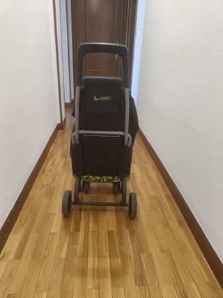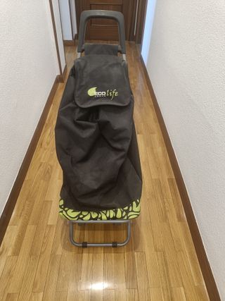 Carro de la compra con diseño moderno y práctico. - Bolsa de tela resistente. - Estructura metálica. - Ruedas para facilitar el transporte. - Detalle de estampado verde en la base.