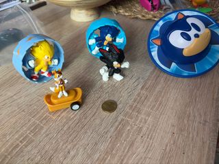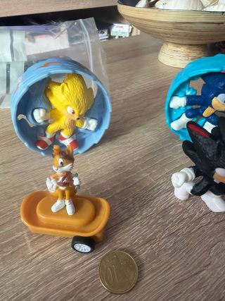 Conjunto de figuras de personajes de Sonic. - Figura de Sonic dorado. - Figura de Shadow. - Figura de Tails sobre patinete.